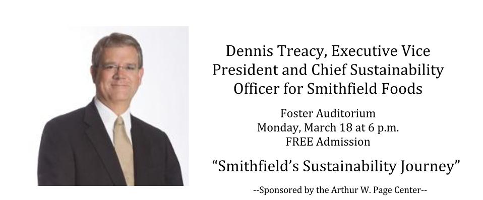 Next week the Arthur W. Page Center has the honor of hosting Dennis Treacy, Executive Vice President and Chief Sustainability Officer for Smithfield Foods. Dennis has agreed to speak to students, faculty and the public about “Smithfield’s Sustainability Journey.” Dennis has been a tireless advocate for sustainability within Smithfield, and we are so pleased to have him talk with the Penn State campus community about his work.